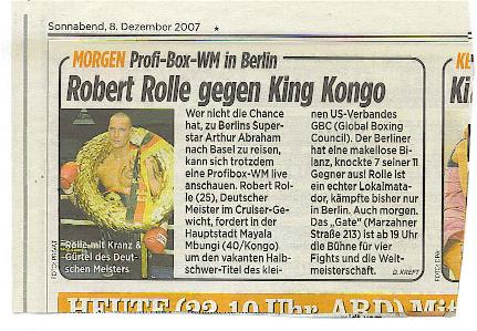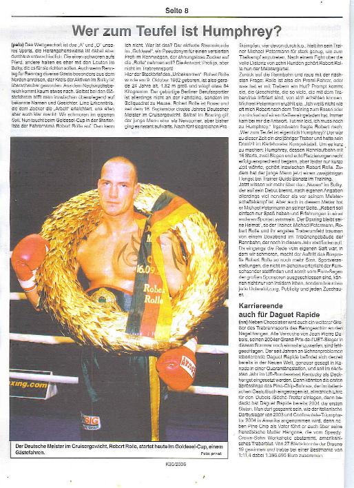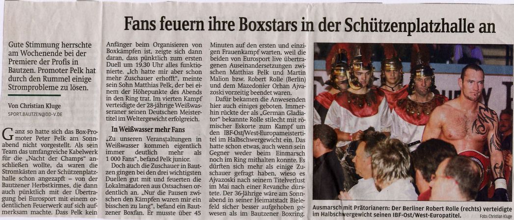 Der Berliner Boxtempel Fighter Robert Rolle hat sich am 16.09.2006 im mit über 800 Zuschauern reichlich gefüllten "Alten Funkwerk" von Berlin Köpenick den Deutschen Meistertitel im Cruisergewicht gesichert. Der Schützling von Michael Petermann errang den Titel durch einen einstimmigen Punktsieg in einer Frank Hogenkamp Veranstaltung über den ins Cruisergewicht aufgestiegenen Weisswasseraner Tino Fröhlich.